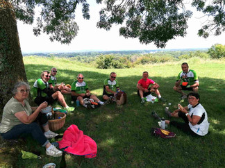 Une partie d’entre nous effectue l’aller-retour à vélo, mais toutes les formules sont envisageables (remerciements à Marie-Françoise qui a assuré le transport des piques-niques !). Sur le vélo, donc, pour rejoindre le dernier mur encore debout du moulin de la Pelouse, au panorama : Françoise LC, Denis, Jacki, Jean-François F. (qui découvrait le rituel de Candes), Jean-Pierre LB, Thierry et François.