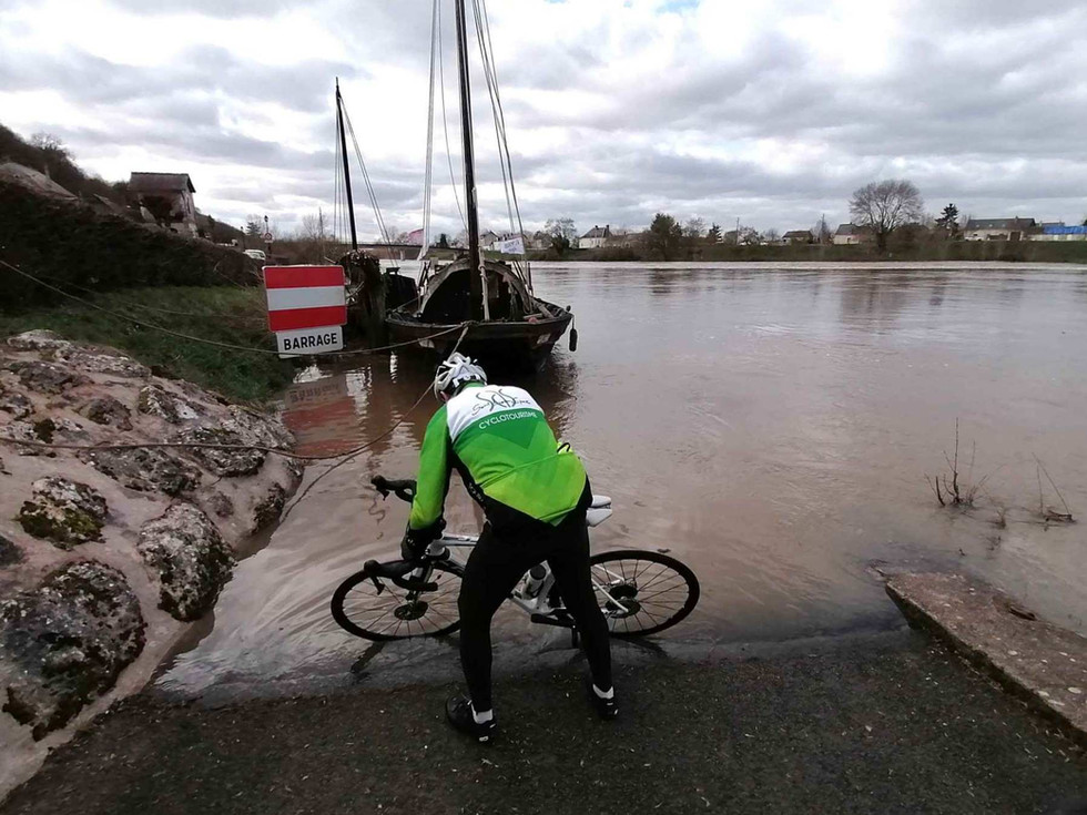 Il n’empêche : à Savonnières, le Cher s’élargit et s’empare de l’accès à la cale. Commode pour l’un d’entre nous ; soucieux de propreté (on préserve son anonymat bien sûr), il profite du niveau de l’eau pour rincer ses pneus boueux. À l’ouest du pont, en direction de Villandry, l’eau recouvre la voie cyclable. Disons-le : c’est historique.
